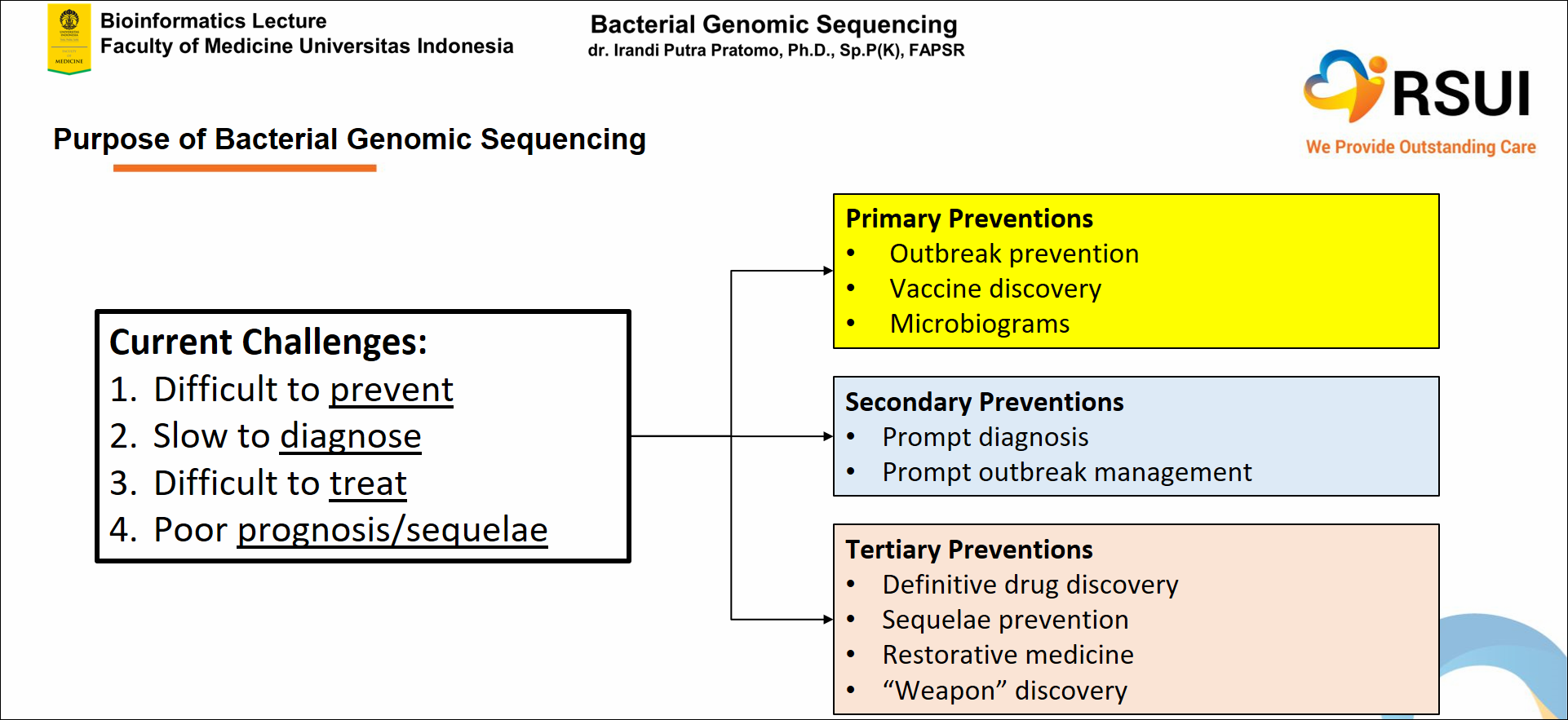 Salah satu perkembangan keilmuan bioinformatika yang penting secara klinis adalah sekuensing genom bakteri. Tujuan klinis untuk pemeriksaan ini adalah deteksi dini dan pengobatan dini pada kasus infeksi bakteri. Demikian juga, metode ini dapat dikembangkan untuk penemuan gen baru yang memiliki peran terhadap mekanisme resistensi antibiotik bakteri, juga untuk pengobatan dan pencegahan seperti penemuan vaksinasi.